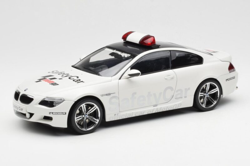 The BMW M6 E63 MotoGP Safety Car 2006 Kyosho 1:18 is crafted from Metalas. Die-cast zinc alloy body with detailed plastic parts, rubber tires, and high-quality paint finish. Die-cast models are known for their weight, durability, and realistic feel.
