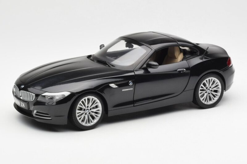 The BMW Z4 E89 Spider Juodas Metalinis Kyosho 1:18 is crafted from Metalas. Die-cast zinc alloy body with detailed plastic parts, rubber tires, and high-quality paint finish. Die-cast models are known for their weight, durability, and realistic feel.