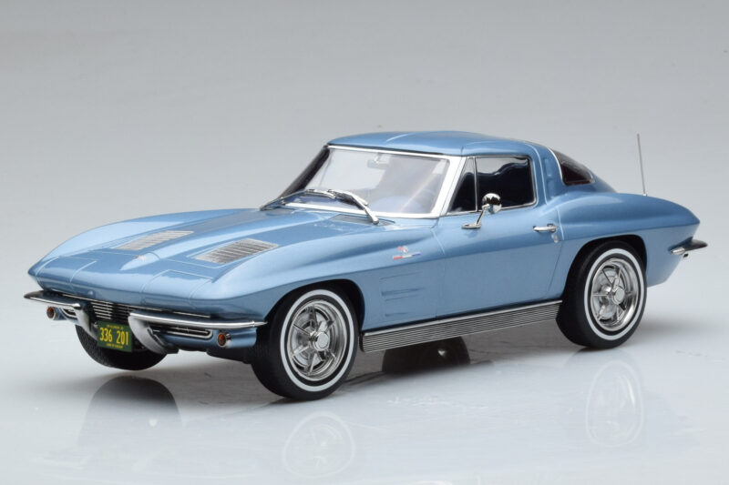 The Chevrolet Corvette C2 Sting Ray Mėlynas Norev 1:18 is crafted from Metalas. Die-cast zinc alloy body with detailed plastic parts, rubber tires, and high-quality paint finish. Die-cast models are known for their weight, durability, and realistic feel.
