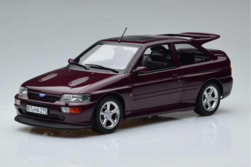 The Ford Escort RS Cosworth Violetinis Norev 1:18 is crafted from Metalas. Die-cast zinc alloy body with detailed plastic parts, rubber tires, and high-quality paint finish. Die-cast models are known for their weight, durability, and realistic feel.