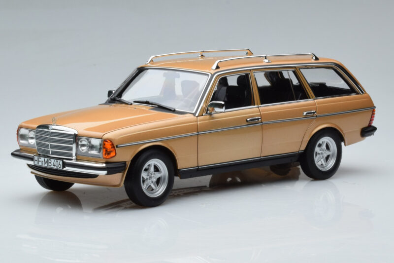 The Mercedes 200T S123 AMG Package Smėlinis Norev 1:18 is crafted from Metalas. Die-cast zinc alloy body with detailed plastic parts, rubber tires, and high-quality paint finish. Die-cast models are known for their weight, durability, and realistic feel.