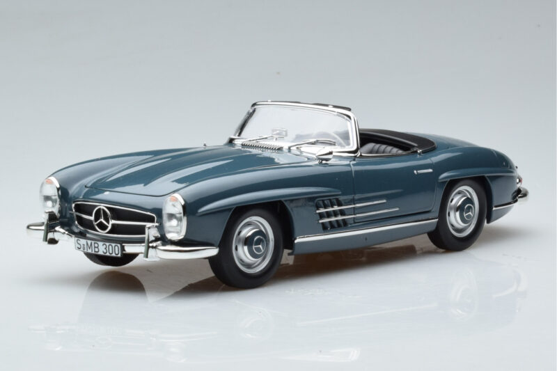 The Mercedes 300 SL W198 Roadster Mėlynas Norev 1:18 is crafted from Metalas. Die-cast zinc alloy body with detailed plastic parts, rubber tires, and high-quality paint finish. Die-cast models are known for their weight, durability, and realistic feel.
