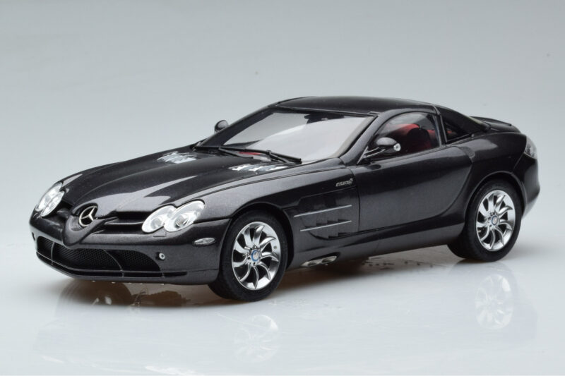 The Mercedes SLR McLaren Juodas CMC 1:18 is crafted from Metalas. Die-cast zinc alloy body with detailed plastic parts, rubber tires, and high-quality paint finish. Die-cast models are known for their weight, durability, and realistic feel.
