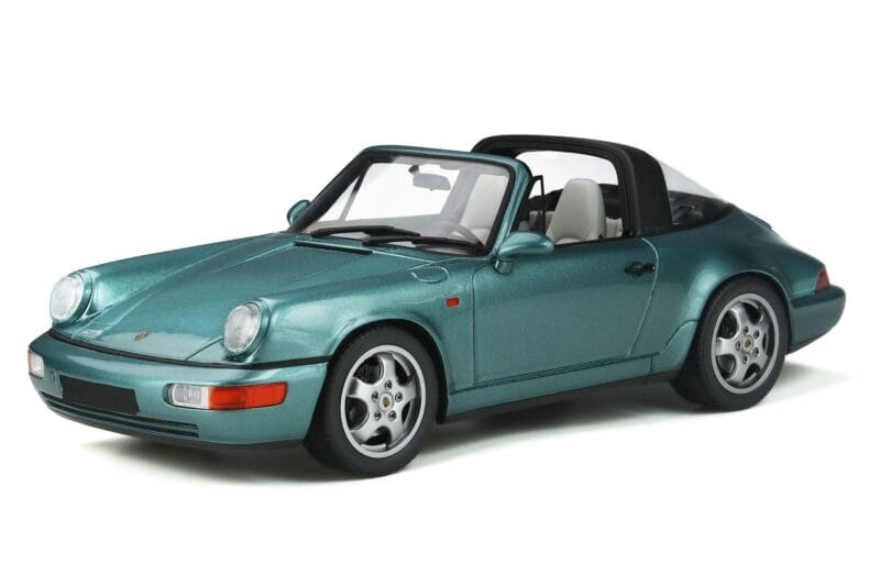 A 1:18 scale model measures approximately 25-28 cm (approximately 10-11 inches). The Porsche 911 964 Carrera 4 Targa Žalias GT Spirit 1:18 is perfect for display in a glass cabinet or on a shelf.