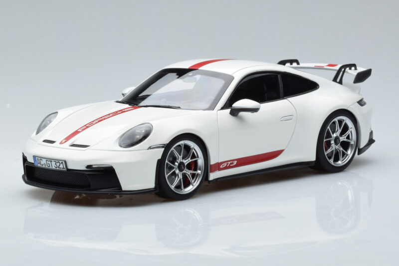 The Porsche 911 992 GT3 Baltas Norev 1:18 is crafted from Metalas. Die-cast zinc alloy body with detailed plastic parts, rubber tires, and high-quality paint finish. Die-cast models are known for their weight, durability, and realistic feel.