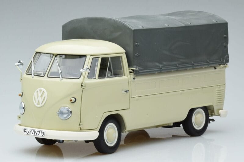 The Volkswagen T1b Pickup Schuco 1:18 is crafted from Metalas. Die-cast zinc alloy body with detailed plastic parts, rubber tires, and high-quality paint finish. Die-cast models are known for their weight, durability, and realistic feel.