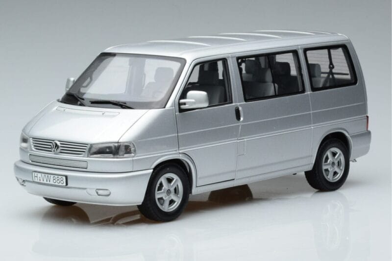 The Volkswagen T4b Transporter Caravelle Minibus Schuco 1:18 is crafted from Metalas. Die-cast zinc alloy body with detailed plastic parts, rubber tires, and high-quality paint finish. Die-cast models are known for their weight, durability, and realistic feel.
